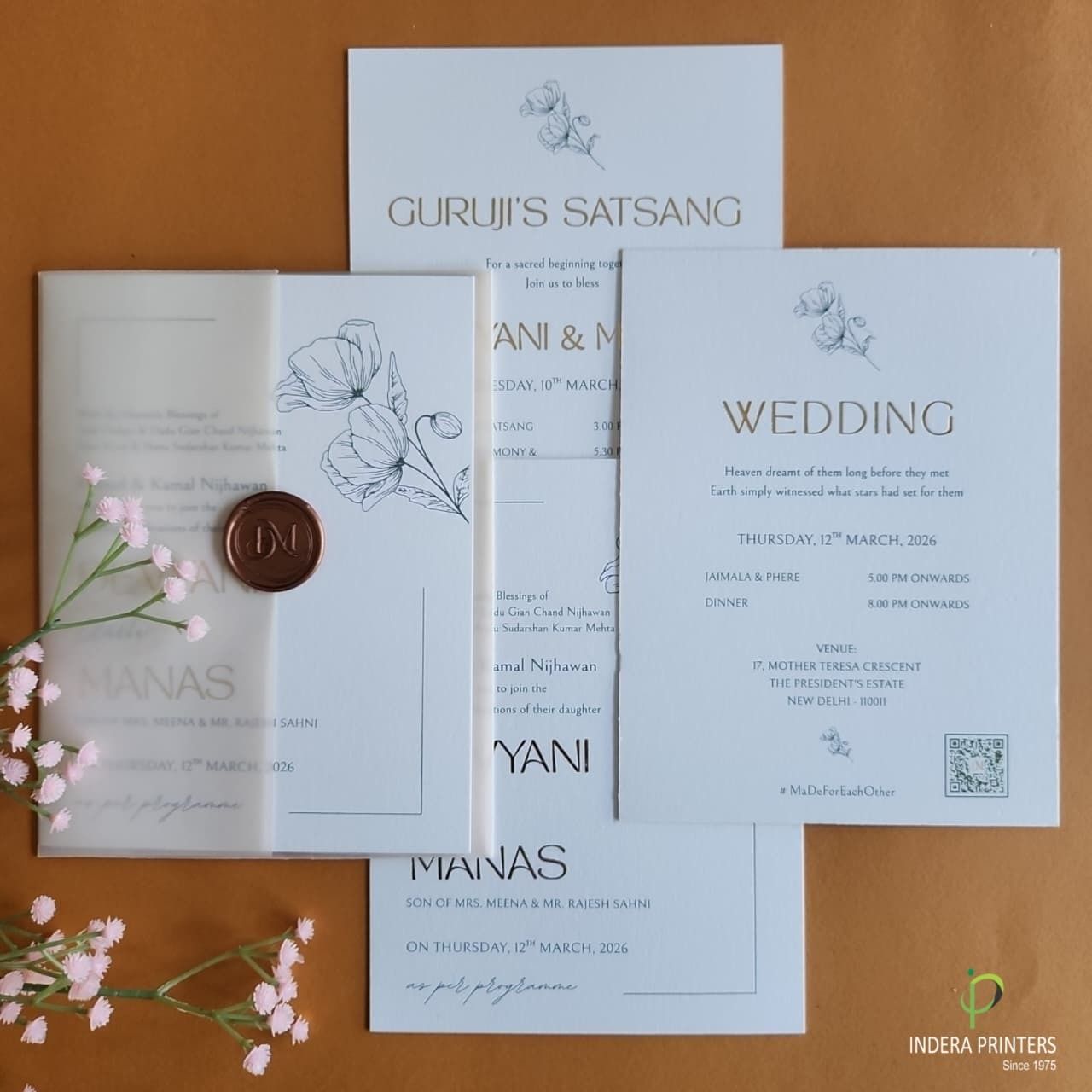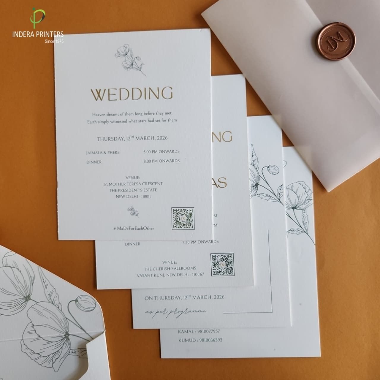 Indera Printers is a Delhi-based wedding invitation services company. They have several years of expertise and skill in the wedding industry and offer a variety of innovative and lovely wedding invitations that will undoubtedly make it the special first step in your wedding planning. They think that if a good invitation isn't created properly, it loses its charm and spirit, and so they strive to provide the best quality services using the finest methods to deliver quality goods to you.