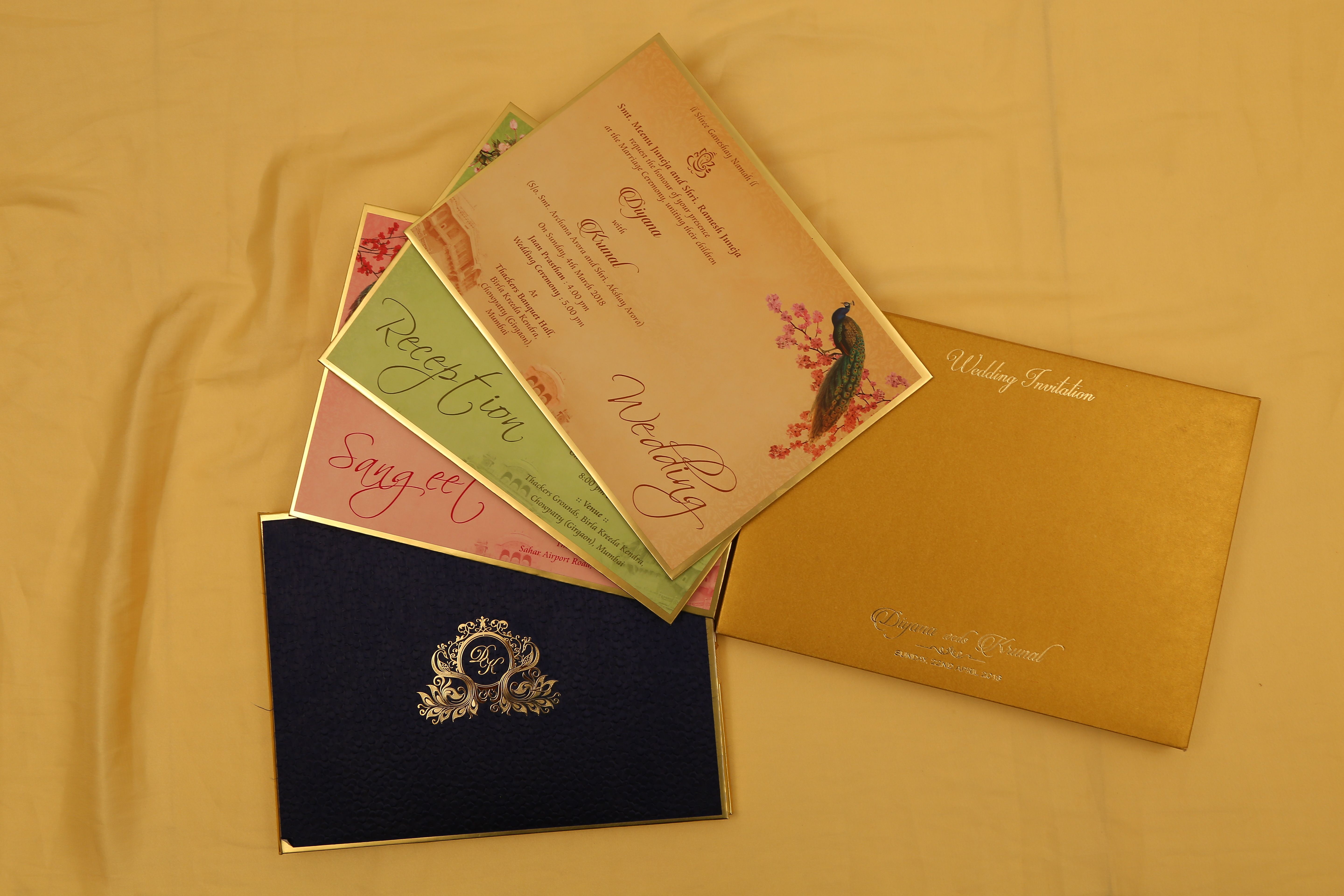 Raga Wedding Cards offers a lot of packages which includes services and facilities like the design of the invite, printing, envelopes, inserts, specialized printing, packaging, accompaniments with the invite, wedding stationery design, wedding stationery printing, name and address label. They also have an option available for domestic and international shipping, available at an additional cost, for your convenience.