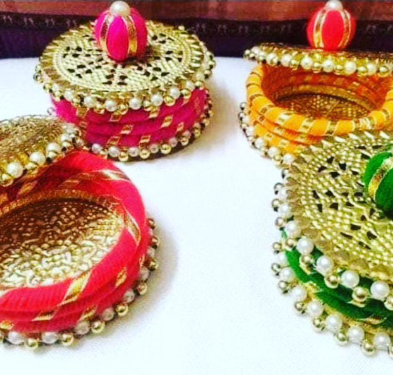 Baskets for Hampers, Sagan Envelopes, Boxes, Saree Bags, Trousseau Trunks, Floral or Gota Jewellery